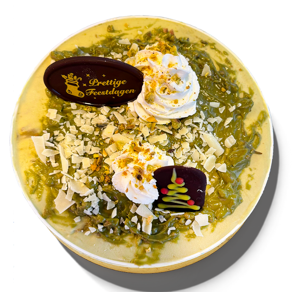 Luxe witte chocolade-ijs geïnspireerd op de virale Dubai chocolade reep, maar dan op onze manier. Perfect formaat feest taart voor 4 personen.